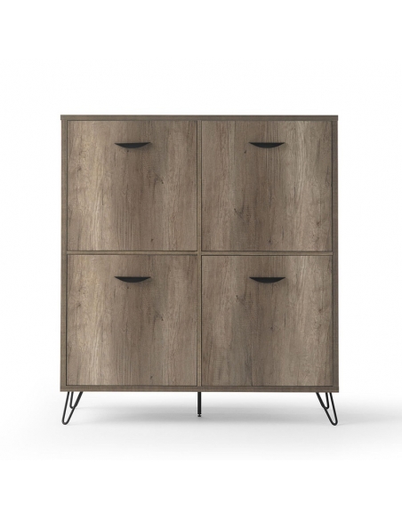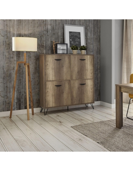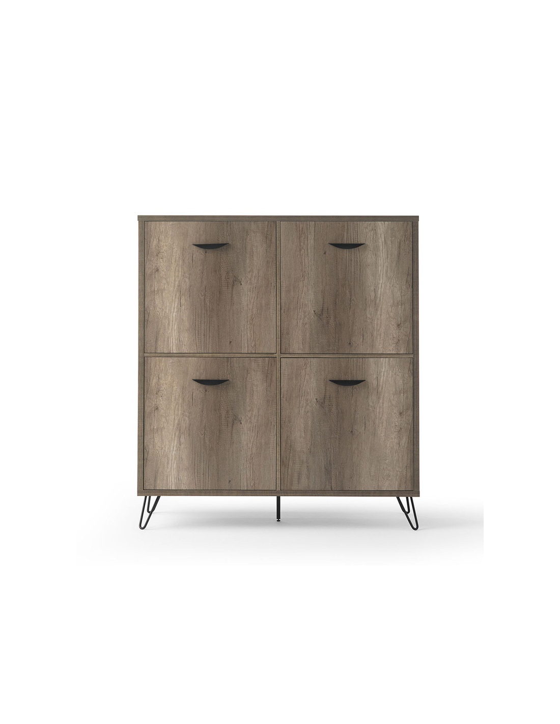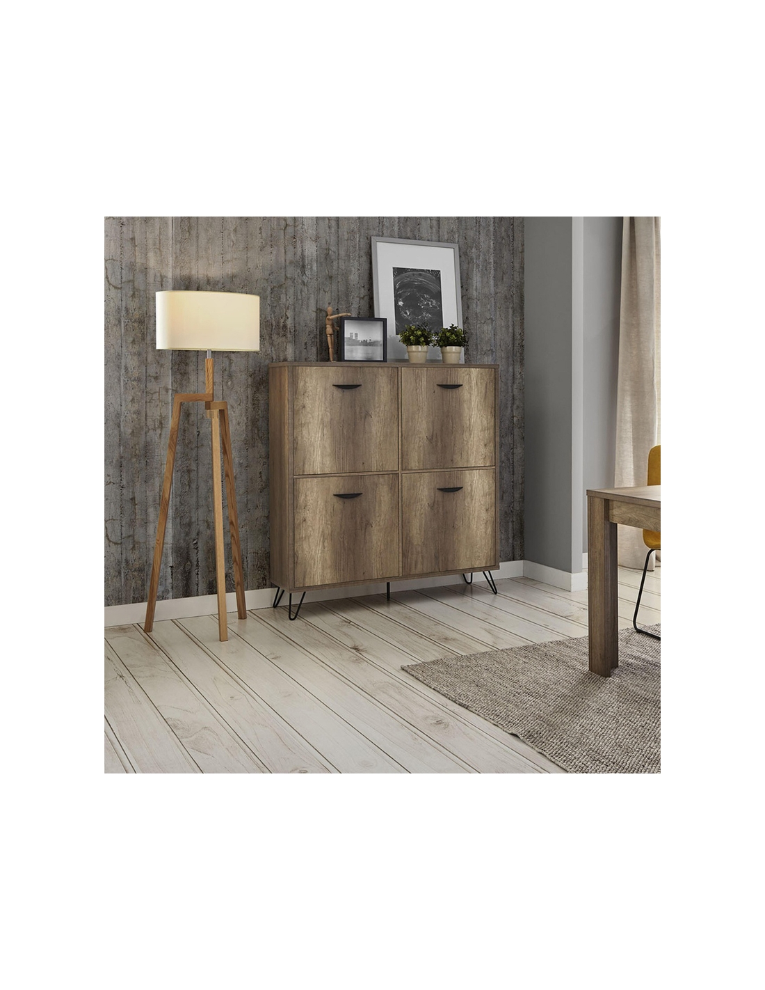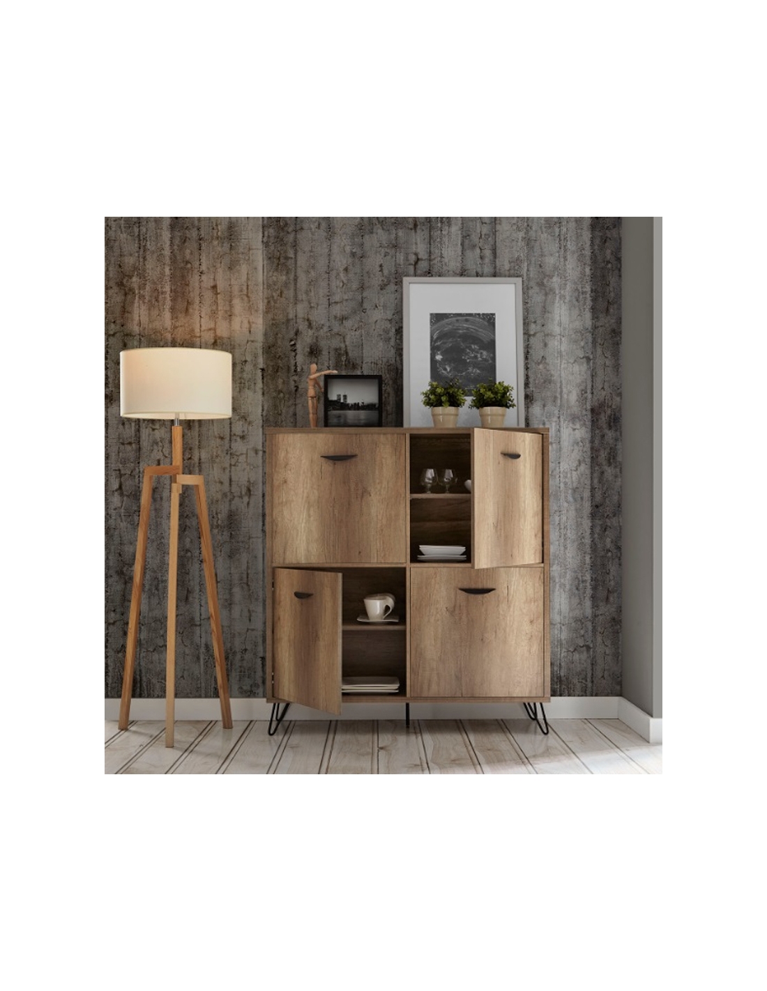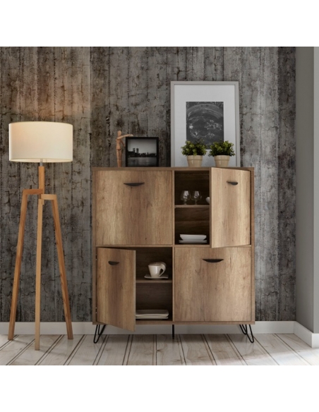 Aparador en color madera de chapa natural con cuatro puertas. En su interior está compuesto de estantes con gran capacidad de almacenaje. También posee cuatro tiradores y pies de acero en color negro.