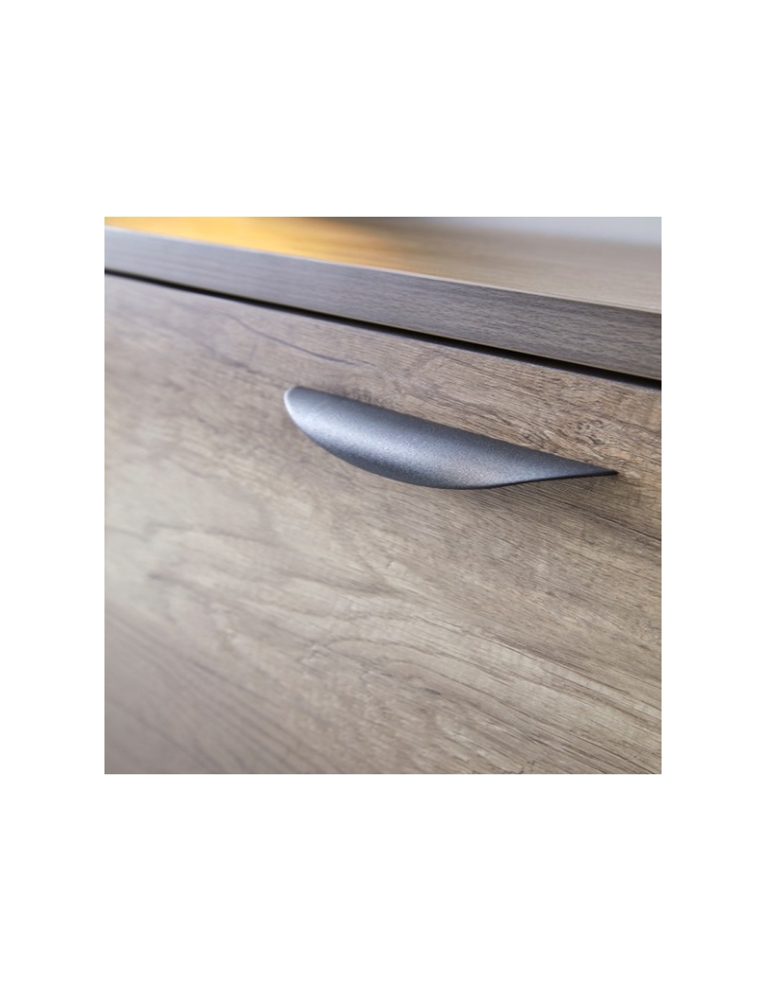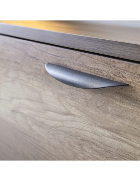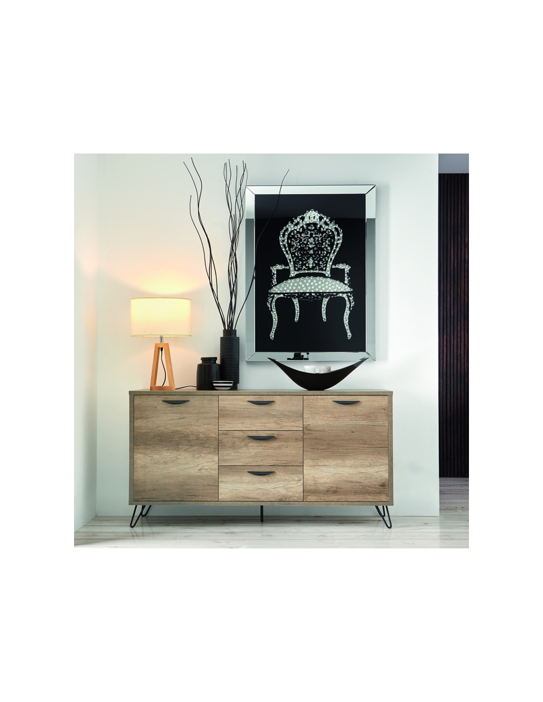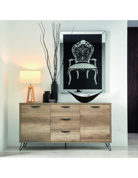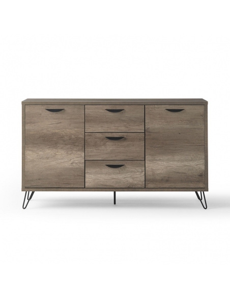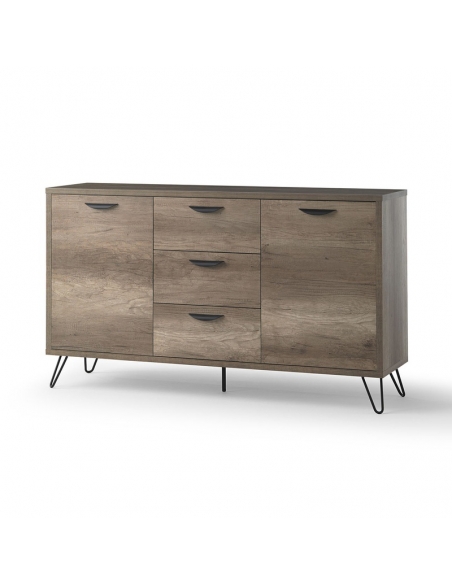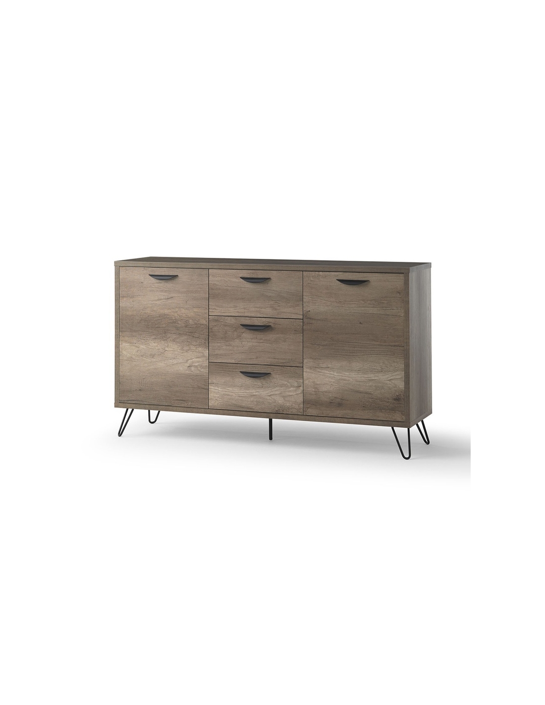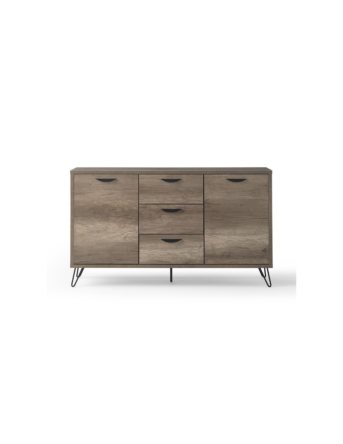 Aparador de melamina en madera chapada del alta calidad. Está compuesto por dos puertas y tres cajones. Dispone de cuatro patas metálicas y una central en color negro.