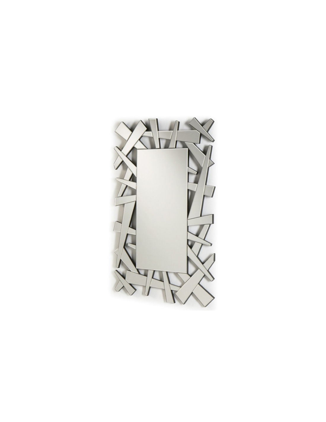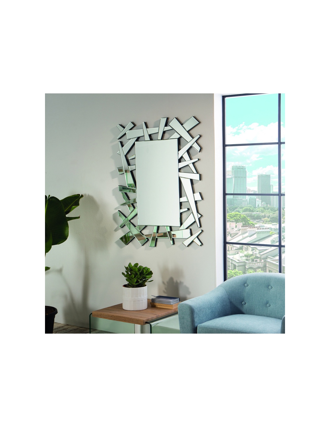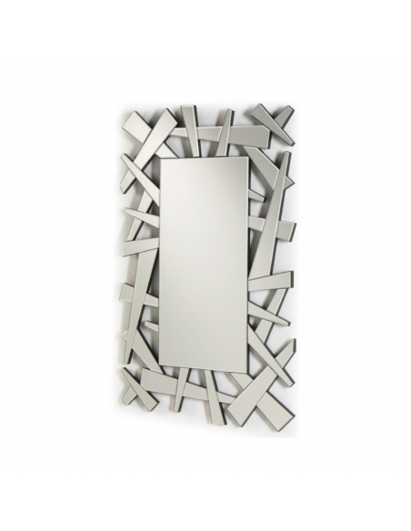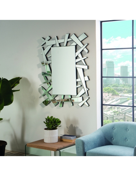 Espejo con diseño moderno de pared rectangular plateado con bordes biselados, marco decorado en múltiples cristales. La parte trasera en madera DM.
