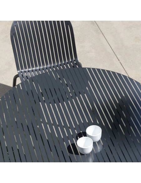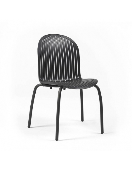 Silla apilable, carcasa en polipropileno tratado anti UV y teñido en masa, patas en aluminio pintado. Dotado de tacos antideslizantes.
