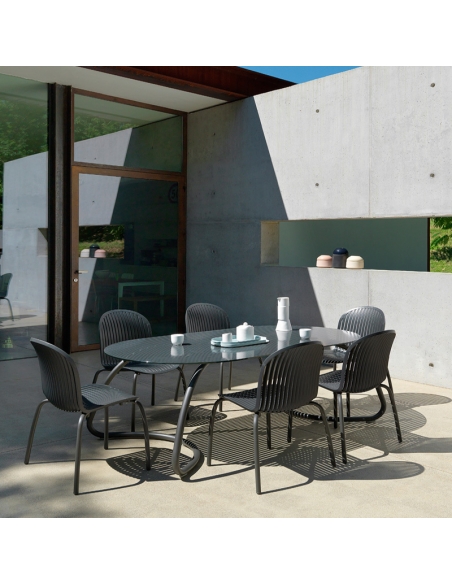 Conjunto de jardín formado por mesa (190x100x73h) con pata en aluminio pintado y tablero de cristal Float de 10 mm de espesor, templado, serigrafiado y vitrificado a 700ºC junto a 6 sillones modelo Ninfea apilables con patas de aluminio pintado con tacos antideslizantes y carcasa en resina. No precisa mantenimiento y es de fácil montaje.