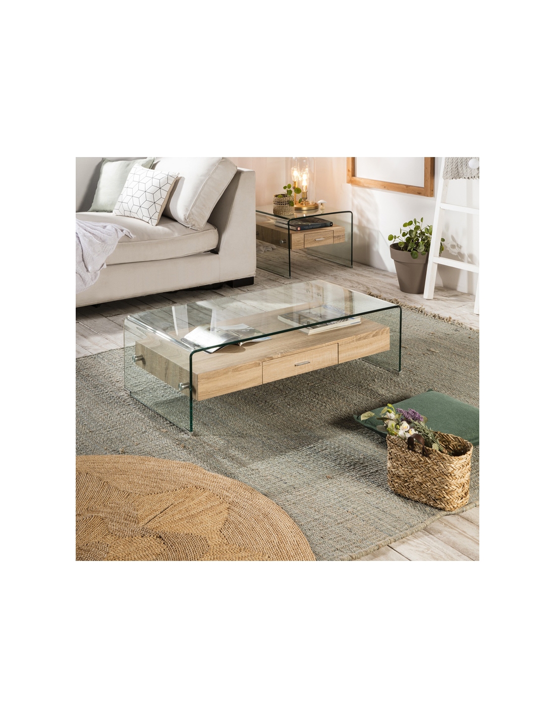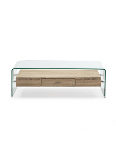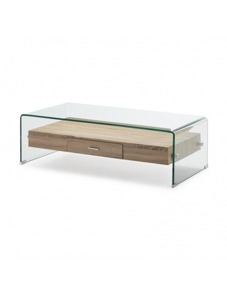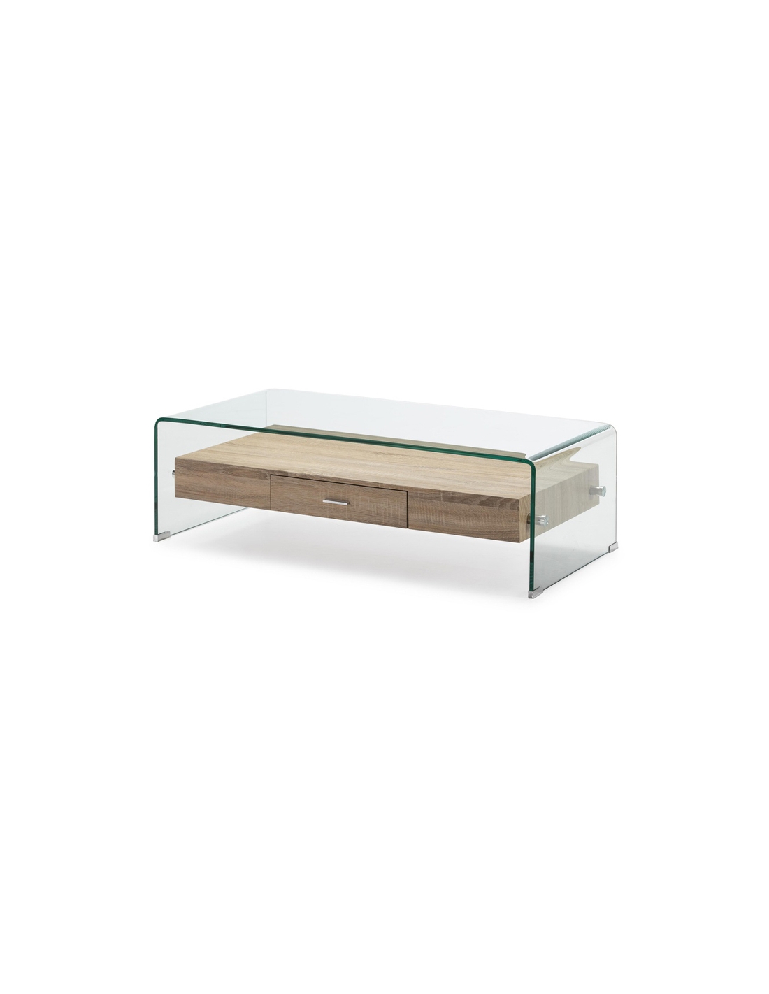 Mesa de centro de cristal templado transparente curvado de 12 mm. Posee una bandeja inferior con cajon en madera chapada y tirador metálico.