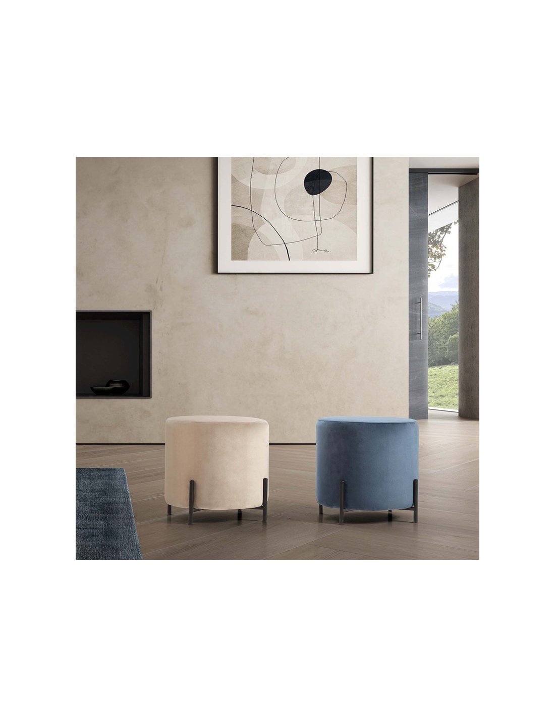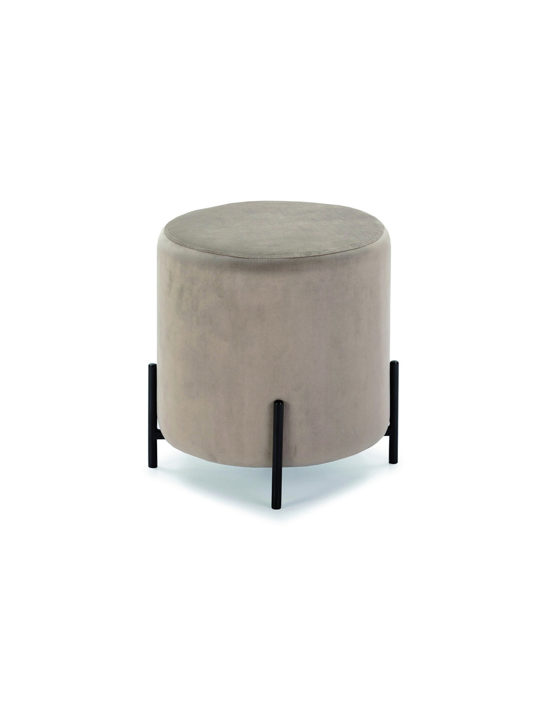 Pouf tapizado y acolchado en tela de terciopelo en color beig combinado con patas metálicas en acero negro.
