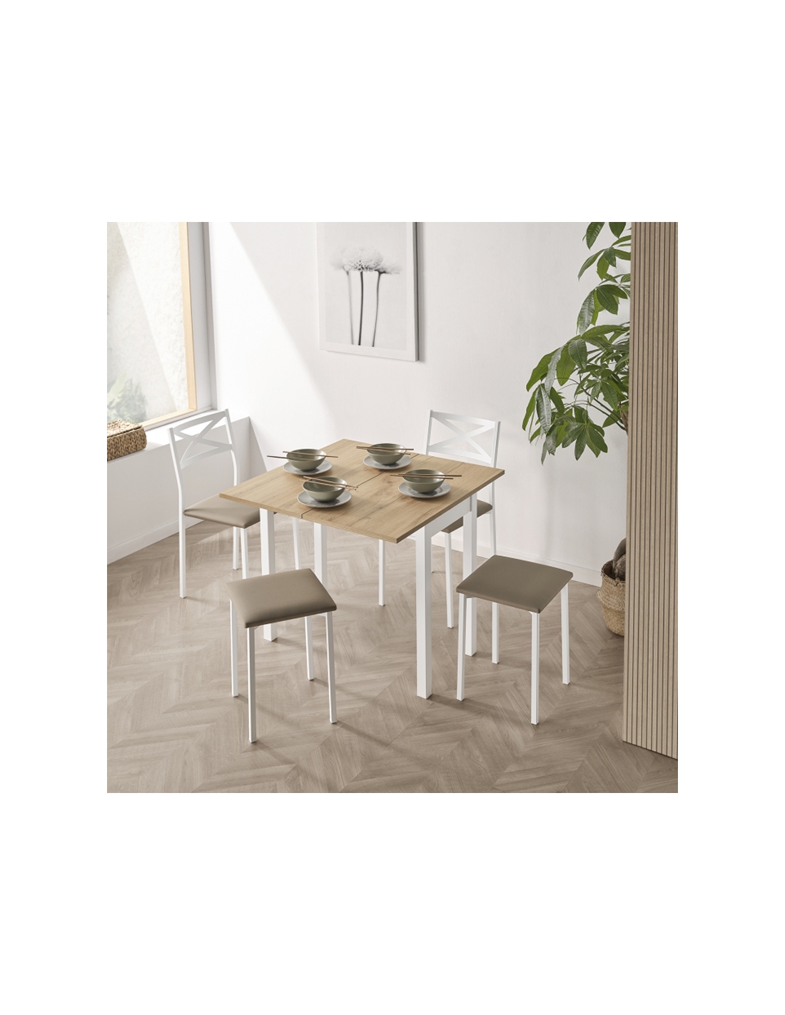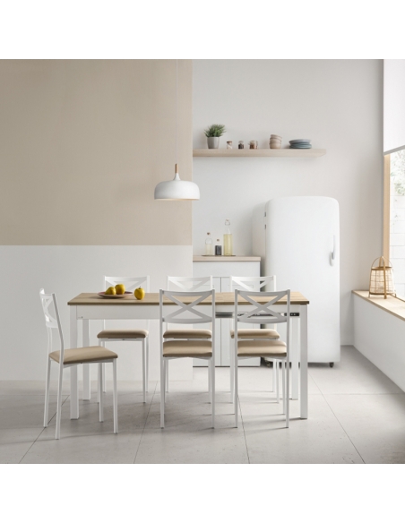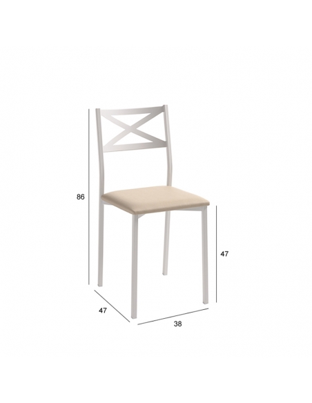 Silla de cocina Bárbara con estructura metálica de tubo cuadrado 20 mm lacada en blanco y asiento en polipiel color michigan arena.