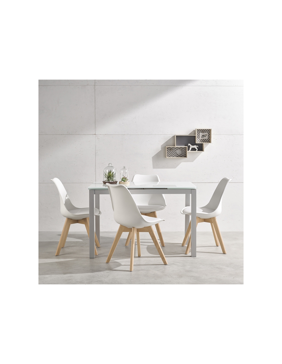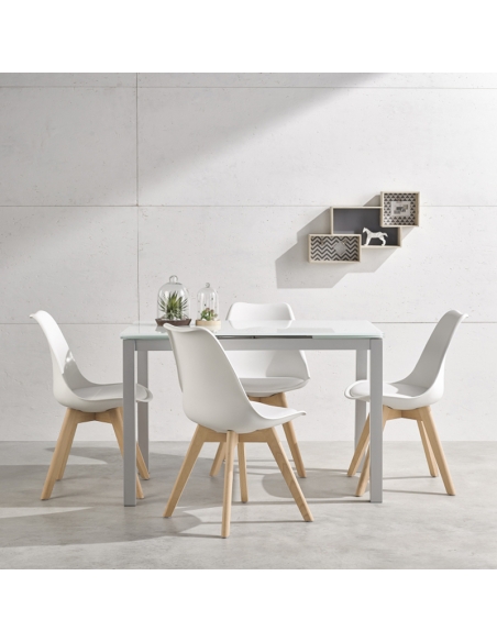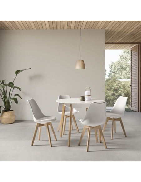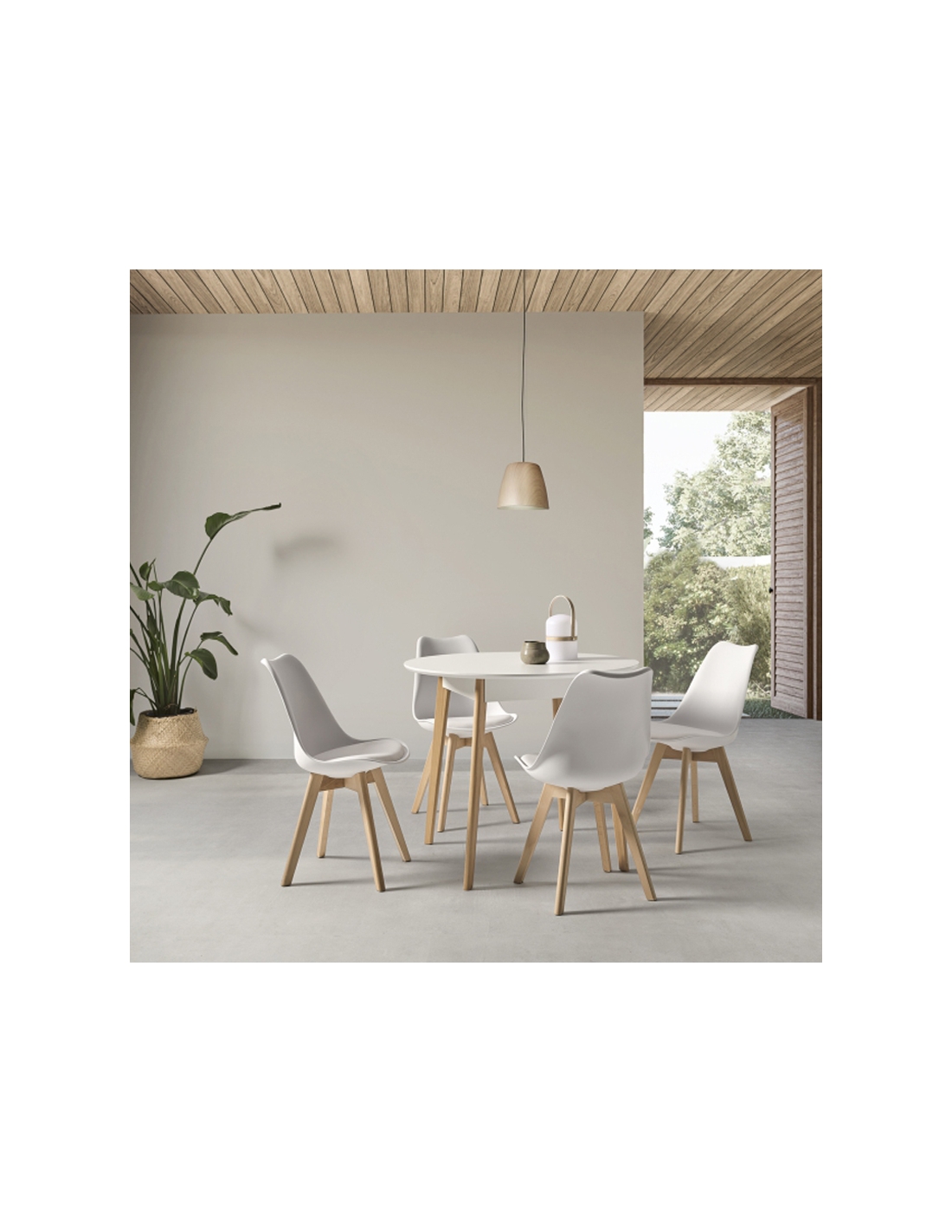 Silla Elba fabricada con respaldo en polipropileno y asiento tapizado en polipiel con patas madera de haya color natural.